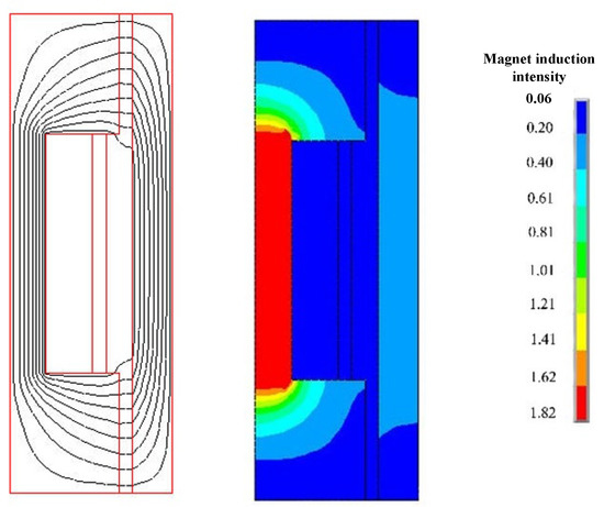 The magnetic characteristics of MR dampers have significant influence on the mechanical properties, so it is necessary to study the magnetic field distribution of this MR damper. The single-coil MR damper is axisymmetric, so it can be simplified as a two-dimensional model with ANSYS, with the axial direction of the damper as the symmetric axis. Figure 6 shows the magnetic induction lines and the magnetic induction intensity distributing of the single-coil MR damper. As can be seen from this figure, the magnetic induction lines all go perpendicularly through the damping gap, and the magnetic induction intensities in the damping gap is uniformly distributed, with nearly 200 mT, when the excitation current is 2.0 A.