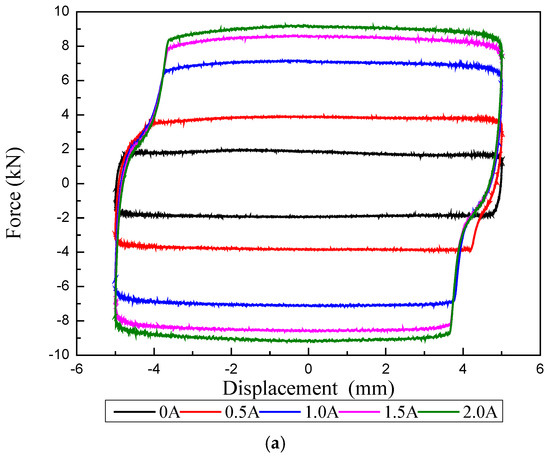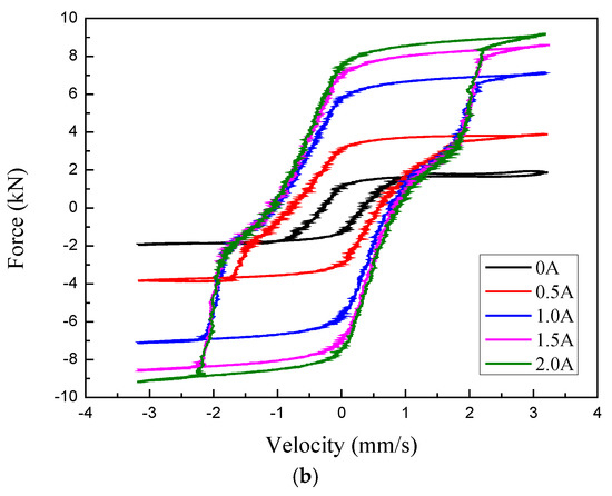 The force–displacement and force–velocity curves of the MR damper were plot‘ted in Figure 7a,b, respectively. In Figure 7, the excitation frequency was 0.1 Hz, and the displacement amplitude was 5 mm. As can be seen from this figure, the force–displacement and force–velocity curves of MR dampers exhibit significant nonlinear hysteresis characteristics. In Figure 7a, when the excitation current gradually increases from 0 A to 1.5 A, the damping force increases greatly, but when the excitation current increases from 1.5 A to 2.0 A, the damping force does not change much, with only a small increment. It can be inferred that the saturation current of this MR damper is 1.5 A. Additionally, when the excitation current increases from 0 A to 1.5 A, the damping force increases from 2 kN to 8 kN, which shows that the damper has good adjustable performance. It can be seen from Figure 7b that the damping force of the MR damper first increases rapidly and then tends to be flat with the increase of velocity. In the high-velocity region, the damping force of the MR damper is basically unchanged, because this period is the process of the damper piston moving rapidly from one end to the other end, and the damping force is stable around the peak value during this process. When the piston moves to one end and is ready to turn, the damping force will drop rapidly.