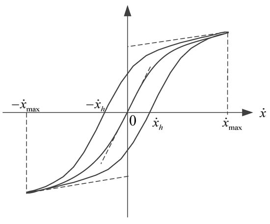 The parameters to be identified in this model include the curve slope , the crossing velocity and the damping coefficient . The curve slope is the slope of the hysteresis curve when the velocity is equal to zero, the cross velocity is obtained by the intercept of the force–velocity curves on the abscissa axis, and the damping coefficient is the slope of the high velocity region of the hysteresis curve, as can be seen in Figure 8. All three parameters are related to the excitation current and maximum velocity . In this study, parametric identification was performed in Origin software, and ‘nonlinear surface fitting’ was used to fit the relationship between the three parameters with excitation current and maximum velocity. The function used in the parametric identification is Poly2D.