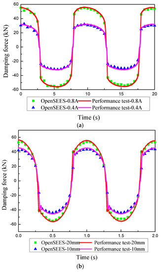By consolidating the element at one point and applying a sinusoidal displacement load to another point, the damping force of the MR damper model at different time can be obtained. In Figure 9a, the sinusoidal displacement loads applied to the element have the excitation frequency of 0.1 Hz, the displacement amplitude of 20 mm, and the current of 0.4 A and 0.8 A, and in Figure 9b, the sinusoidal displacement loads applied to the element have the excitation frequency of 1.0 Hz, the current of 0.4 A, and the displacement amplitude of 10 mm and 20 mm, which are both the same as the loading conditions of the MR damper performance tests, and the parameters of the model in OpenSEES are the same as the dimensions of the MR damper [38], so the accuracy of the MR damper model established in OpenSEES can be verified by comparing the damping forces calculated from OpenSEES with performance test results.