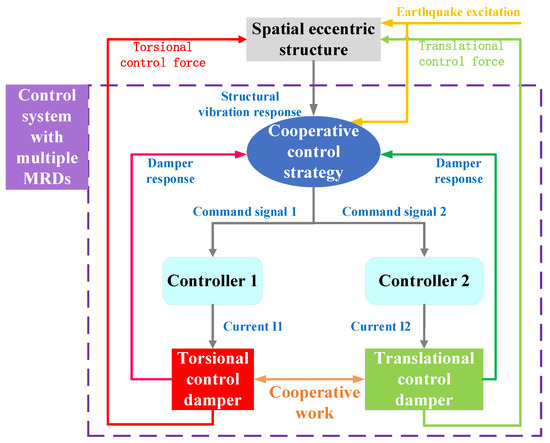 Figure 10 is the work flow diagram of the control system with multiple MR dampers, and the detailed steps to implement the control strategy for the control system with multiple MR dampers can be seen from this figure. The spatially eccentric structure will have coupled translation-torsion vibrations under earthquake excitations. The proposed control strategy will output corresponding command signals to the two controllers in the system according to the structural vibration response and seismic excitation collected by the sensors. The two controllers output different currents to the two types of MR dampers arranged in the structure to ensure the cooperative work between them. Additionally, the vibration signal of MR dampers will also be output to the control strategy, and the control system output by the control strategy can be adjusted in real time. Ultimately, two types of MR dampers apply torsional and translational control forces to the structure, forming a complete closed-loop control of the coupled translation-torsion vibrations of the spatial eccentric structures.