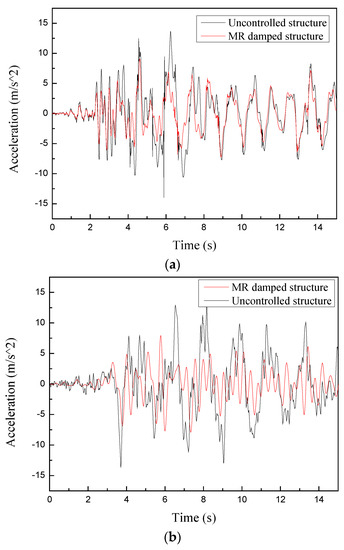 Acceleration time history responses of the uncontrolled and MR damped structure. (a) El Centro. (b) Taft.