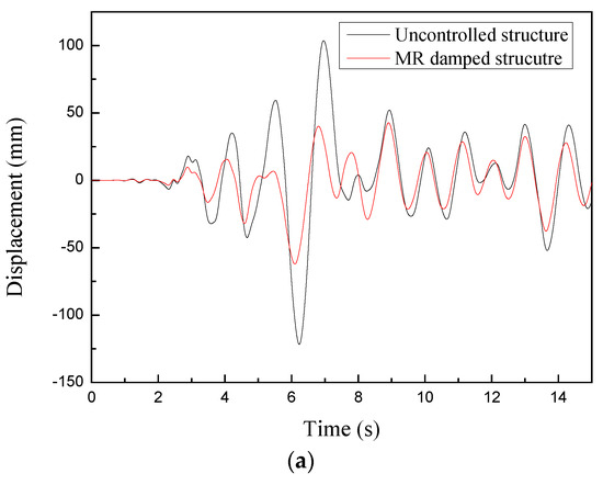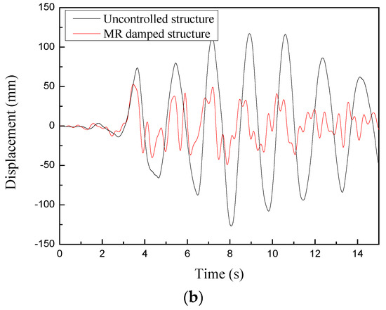Displacement time history responses of the uncontrolled and MR damped structure. (a) El Centro. (b) Taft.