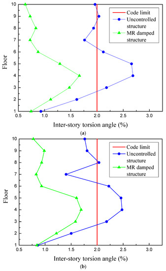In order to verify the suppression effect of the multiple MR dampers in the torsional irregularity of spatial eccentric structures, the inter-story torsion angles of the uncontrolled and MR damped structures are compared. The inter-story torsion angle can be obtained by subtracting the time–history curves of the rotation angles of the upper and lower floors around the rigid center and then taking the maximum absolute value, and it can intuitively reflect the torsion degree of each story for torsional irregular structures, as can be seen in Figure 14.