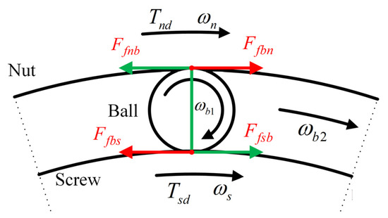 When the absolute speed of the screw motor is larger than the nut motor, the friction force of the screw and the nut on the ball will jointly form a moment of force so that the ball on the one hand self-rotates, and the public rotates around the center of screw on the other hand. The reaction force of the ball on the screw is an impede moment for the screw shaft, but the reaction force of the ball on the nut is an increased moment for the nut axis. The phenomenon of different positive and negative work done by the ball on the screw and the nut is called the frictional coupling model. Replace linear friction ( F f i j ) with rotary friction ( T f i j ). Due to the complex motion of the ball and the special structure of the DDMS, the relationship between T f i j and F f i j is not discussed in this paper. When the absolute speed of the screw is larger, in order to maintain the public rotation of the ball has: