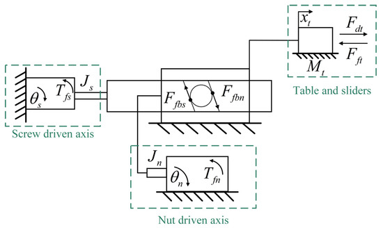 In order to obtain high-precision motion control, Prof. Feng proposed the dual-drive micro-feeding system (DDMS) [5,6], in which a permanent magnet synchronous motor (PMSM) is arranged for both the screw and the nut. These two motors rotate, and with the same direction and almost equal velocity are superimposed to achieve high-precision feeding of the driven worktable at ultra-low speed, and both the screw and the nut rotate at the speed outside the non-linear region, which eliminates the effect of non-linear friction at low speeds in both axes. The DDMS has two structural forms: hydraulic screw drive and ball screw drive. For the DDMS based on the hydrostatic screw nut pair, Su proposed a numerical model for the flow boundary for the hydrostatic screw [7], and Liu investigated the boundary slip characteristics within the hydrostatic screw under both DDMS and CFDS driving methods [8]. For the DDMS based on the ball screw nut pair, Yu performed a velocity spectrum analysis [9], Du proposed a full component friction identification model [10], and Wang investigated the effect of torque harmonics on the speed fluctuations of linear feed systems at low speeds; compared with CFDS, DDMS avoids the system resonance caused by torque harmonics at certain speed points [11]. These studies have demonstrated that the DDMS has better low-speed micro-feed performance than the conventional drive feeding system (CDFS). The research subject of this paper is mainly the DDMS based on the ball screw.