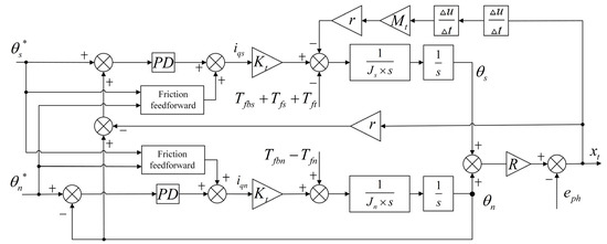 In the DDMS, a feedforward control method can be used to improve the system‘s tracking performance. When the closed-loop system is continuous, let the product of the feedforward link and the closed-loop system transfer function be equal to one, so as to achieve the complete reproducing input [22,23,24]. The constructed control block diagram based on PD with friction feedforward is shown in Figure 4. In the control block, according to paper [25,26], the PMSM’s electromagnetic torque is simplified by using magnetic field directional control as follows: