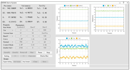 The schematic diagram and photos of the experimental equipment are shown in Figure 5. The feed drive with a stroke of 280 mm is equipped with a ball screw (DIR 1605, THK) with a diameter of 16 mm. The ball screw is driven by two PMSMs (Panasonic MHMF042LV2M) with a rated power of 400 W, and the rated torque is 1.27 N · m . The motor is equipped with a high-resolution rotary encoder (23 bits) to provide motor position feedback and is connected to the servo driver (Panasonic MBDLT25BF), which communicates with the industrial control computer (ICC) via EtherCAT protocol. A raster ruler with a 10 nm resolution scale (KEYENCE GVS 600T) is used to measure the worktable position, and it is connected to the screw servo driver, of which external sensor monitoring function is enabled to read the raster ruler pulse data for fully closed-loop control at the ICC. An environment of Windows10+VS+QT in the ICC is used to develop the control software, with which secondary development of KRMotion is performed using the process data object (PDO) function to read motor position, speed, torque, and external raster ruler data directly, with a sampling frequency of 4 kHz and a control period set to the same as the sampling period, i.e., 250 us. KRMotion is a real-time motion controller developed by the Shandong E-Code company based on the German Kithara real-time suite (KRTS) [27,28]. The interface of ICC software developed is shown in Figure 6. The specific parameters of the experimental equipment are shown in Table 1.