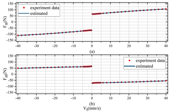 The frictional data obtained were fitted using the GA, and the experimental and estimation frictional curves of the screw and the nut are shown in Figure 7. The results of the fitted parameters are shown in Table 2.