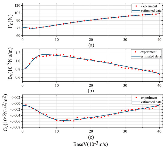 Figure 8. Dynamic variation curves of frictional parameters. (a) Variation curve of Coulomb frictional coefficient ( F c ) with base velocity. (b) Variation curve of viscous frictional coefficient ( B v ) with base velocity. (c) Variation curve of centrifugal force coefficient ( C v 2 ) with base velocity.