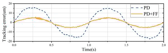 The tracking error of using PD with FF and PD controllers alone is shown in Figure 9; the comparisons of tracking errors are shown in Table 5. It can be seen that the proposed controller and the error compensation method play a nice effect, the average tracking error is reduced by 60% and the peak is reduced by 70%.