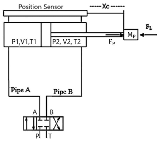 where denotes the rod’s displacement, is the piston mass, and is the load mass, which causes the payload force of on the actuator. represents the viscous friction coefficient for the piston movement.