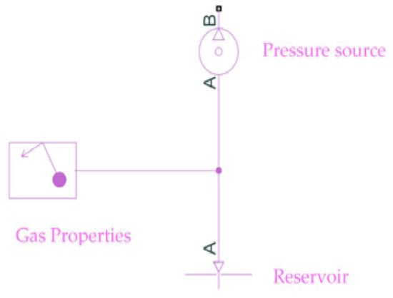 For simulating the gas behavior in SimScape, a supply unit, as shown in Figure 2, has been set up. The gas properties, together with the thermal conductivity and dynamic viscosity, which are used in modeling the gas transport behavior, are defined in the SimScape Gas properties block. The system’s reference temperature and pressure, which are taken as atmospheric temperature and pressure in this model, are defined by the SimScape Reservoir block, and the air compressor is modeled by a Pressure source block. The SimScape Pressure source block has two ports and is capable of maintaining a constant pressure difference between its ports. Therefore, by connecting the input port to the reservoir, a set pressure gas can be injected into the system.