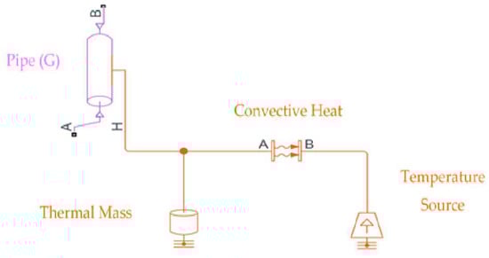 The pipe properties for modeling the conduction heat transfer in the pipe’s wall can be adjusted in the thermal mass block, and the parameters for modeling the convective heat transfer between the pipe’s wall and the surrounding environment can be set in the convective heat transfer and temperature source blocks. The temperature source can maintain the atmospheric temperature regardless of the amount of heat flow into the system. The conduction heat transfer in the pipe’s wall can be mathematically modeled by