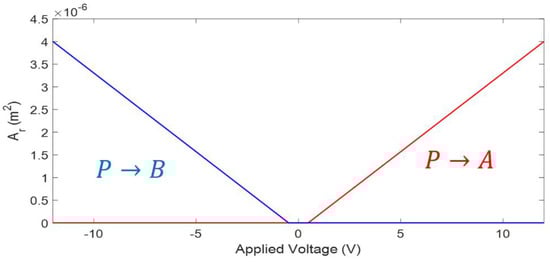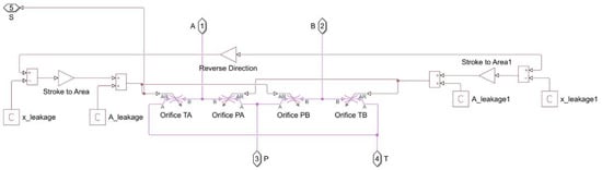 The local restriction (G) block has been used for modeling the valve in the SimScape environment. Each active state of the valve can be modeled by two local restriction blocks connecting ports P and T to ports A and B in Figure 1. The block allows modeling the valve leakage by defining a non-zero minimum restriction area, . Moreover, the valve spool displacement, , has been used to adjust the orifice area. The orifice cross-sectional area is linearly proportional to the spool displacement as