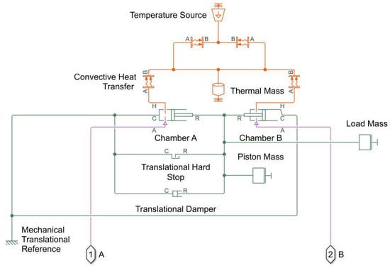 Moreover, a translational hard stop block is used to restrict the cylinder interface movement within the length of the cylinder. The viscous friction coefficient for the piston movement can be modelled by a translational damper block. Two mass blocks are used for modelling the load and piston masses. The convective heat transfer, thermal mass, and temperature source blocks can model the heat transfer between the chamber gases and the surrounding environment. The motion equation for the load connected to the piston rod is equal to