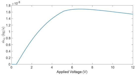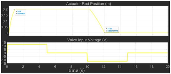 We then apply an input voltage to the valve and measure the rod’s displacement. This is depicted in Figure 8. The input signal is selected in such a way as to take the valve’s spool to its extreme positions. An applied 12 V signal charges chamber 1 and allows gas to be exhausted from chamber 2, which causes the rod to extend to its maximum displacement, 0.2 m. The signal has been applied long enough so that the system can be settled. The valve is then moved to its neutral state by applying 0 V, and as is shown, the rod’s displacement remains unchanged. By applying −12 V to the valve, the gas in chamber 1 exhausts, and chamber 2 fills with gas, moving the piston inward until it reaches zero. Again, a 0 V signal has been applied to move the valve to its neutral state, where holding the rod’s position unchanged. The response transition time is around 2 s.