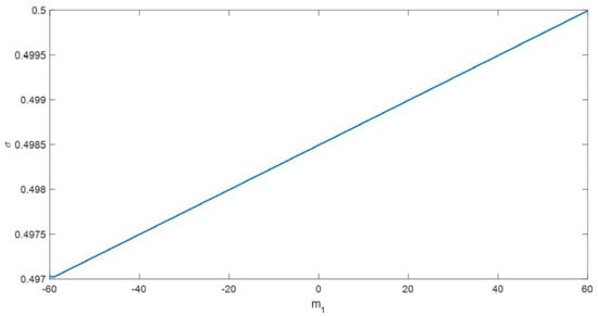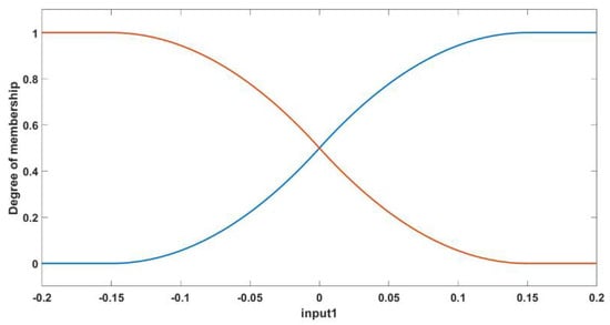 In the other approach proposed in [47], a type-1 T–S fuzzy observer is used to develop a piecewise control strategy for dealing with the nonlinear terms in the system. The membership functions employed for constructing the observer is depicted in Figure 12. The controller gain is calculated as [5.37, −5.37].