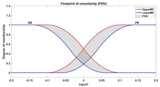 where denotes the interval type-2 (IT2) fuzzy set of the premise variable, , and and are the number of fuzzy IF-THEN rules and fuzzy sets of controller, respectively. are nonlinear weight coefficient functions that are calculated based on upper and lower membership functions. The footprint of uncertainty (FOU) for the employed T-S fuzzy system is given in Figure 11. Two fuzzy rules are defined taking the system error as the state variable and the coefficients are selected according to a procedure explained in the reference as and . The feedback control gains are then calculated as and .
