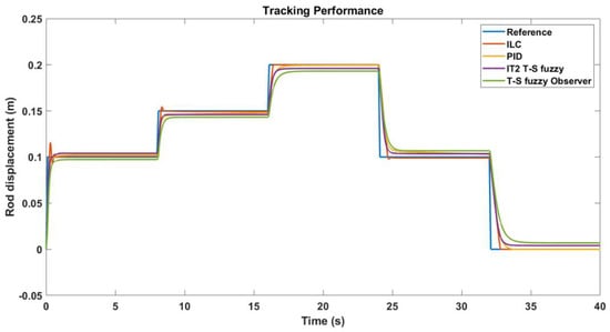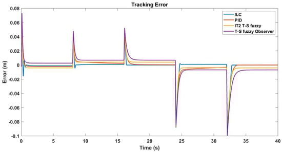 The performance of the controllers in tracking a reference signal under a constant load of 10 kg is shown in Figure 13. As is seen, the designed ILC is capable of tracking a non-repetitive signal. Next, we compare the performance of the ILC with the other controllers, which is given in Table 2. It can be seen that the ILC demonstrates a faster response, however, it demonstrates overshoots in the transient response. The maximum overshoot percentage happens during the forward motion when the actuator moves from the resting to reach 0.1 m, which equals 13.5%. This can be considered as the major drawback of the ILC, which is caused by the way that ILC calculates the control signal. The ILC only modifies the control signal according to predefined control law and based on the historical input and output. Therefore, a sudden change in the input signal will cause overshoot in the control signal. However, in a well-designed ILC that holds monotonic convergent, the gap between the input and output is reduced after sufficient iterations. The ILC can obtain ±0.002 m precision (2% settling time) in 0.52 s compared to 0.46 s for the PID and 0.35 s for the IT2 T_S fuzzy controller. The controller based on T-S fuzzy observer could not achieve the required precision. The difference between the reference and output of the system controlled by each of these controllers is shown in Figure 14, and the summation of the square of the error () is given in Table 2. The ILC demonstrates superior performance than other controllers in terms of both speed (rise time) and tracking accuracy.