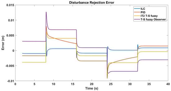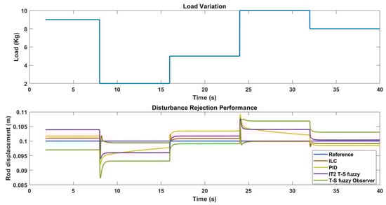 Next, we compare the performance of the controllers in overcoming the payload uncertainty, as is shown in Figure 15. The top plot in this figure shows the payload variation applied to the piston while the reference signal remains constant at 0.1 m. As is seen, the ILC-controlled system can maintain the required precession (±0.002 m) regardless of changes in the load. However, this cannot be adequately achieved with the other controllers. The plot of the disturbance rejection error is given in Figure 16. The summation of the square of the error for the controllers is given in Table 3. Again, the ILC shows a better performance than the other controllers in overcoming the uncertainties.