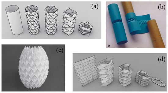 Cylindrical origami. (a) Yoshimura pattern. Reprinted with permission from [23]. Copyright 2010 Royal Society. (b) Kresling pattern. Reprinted with permission from [24]. Copyright 2008 Royal Society. (c) Waterbomb pattern. Reprinted with permission from [25]. Copyright 2016 Royal Society. (d) Tachi–Miura pattern. Reprinted with permission from [23]. Copyright 2010 Royal Society.