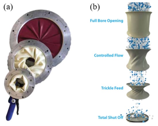 Iris valves. (a) Different sizes of iris valve. (b) The folding process of iris valve sleeves. (Images from https://www.mucon.com/ (access on 25 August 2022)).