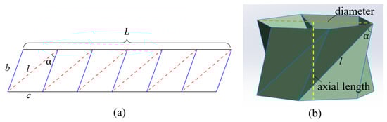 The geometric definition of the Kresling pattern is established before exploring its radial closability. This paper only discusses the single-stacked Kresling structure and assumes that the tube ends remain parallel during the folding process. It is generally accepted that the Kresling structure is a cylinder composed of multiple parallelograms, each of which is separated diagonally by a valley crease (Figure 4). Biruta [24,39] narrowed this definition according to the shape generated by natural twist buckling: