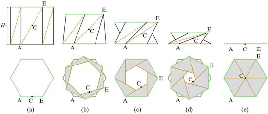 Kresling pattern folding process. (n = 6) (a) Fully unfolded state. (b–d) Folding process. (e) Fully folded state. Line AE represents a diagonal, and C is the midpoint of the diagonal.