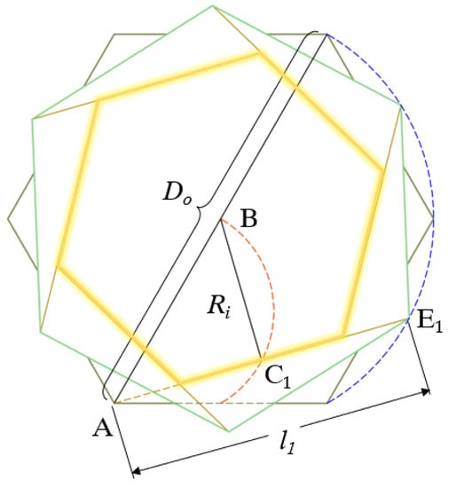Radial closability refers to the intersection of the diagonal of each element with the tube axis when fully folded, which creates a barrier that completely closes the tube. It is different from the closure condition stated by Zhang et al. [50], which refers to the horizontal creases that constitute regular polygons from the initial planar configuration to the folded configuration. The radial closure conditions can be derived from the fully folded state since the diagonal’s midpoint falls at the polygon’s center (Figure 5). Then,