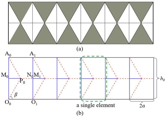 The goal-directed creation process of the RC-ori is explained in detail as follows. The diaphragm consists of multiple identical isosceles triangles in the fully closed state (Figure 5e). When these isosceles triangles are drawn on flat paper, the pattern shown in Figure 8a can be obtained. The white area is folded into four overlapping right triangles along the centerline and sandwiched between the upper and lower isosceles triangles when the cylinder is fully folded. They help the isosceles triangles form the complete one-piece structure of the origami. So far, the single element of the new crease is similar to the waterbomb pattern, and the arrangement makes it look more like a Yoshimura pattern.