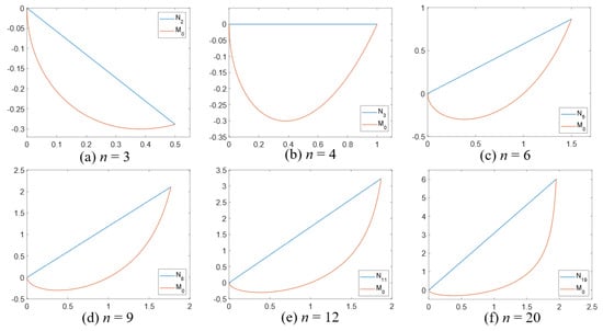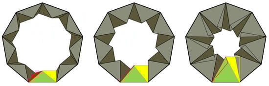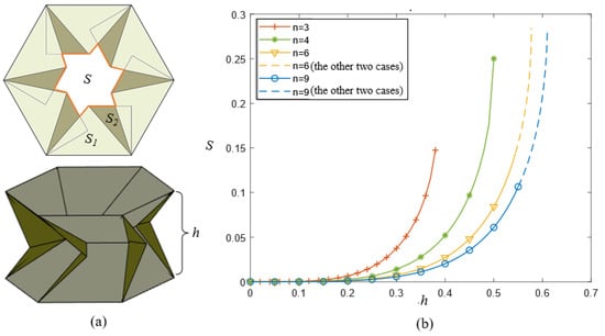 Figure 13b shows the relationship between h and S. It can be seen that there is only one circumstance for the open area when n = 3 and n = 4, while there are three cases when , as shown in Figure 14. When it starts to fold, there are three covered triangles of each element in the top view. When it is folded to a certain extent, one of the covered triangles is overlapped. Nonetheless, the difference in the curve trend between the three cases is small. Meanwhile, when the structure is fully folded (h = 0), the tube is completely closed (S = 0), and when it is fully unfolded (h = ), the opening area is equal to the polygonal area (S = ), which meets the valve control requirement well. Figure 13b also shows that the adjustment range of the opening area expands with the increase in n, and the expansion is insignificant when , which means the hexagonal prism(n = 6) is an ideal option for modeling.