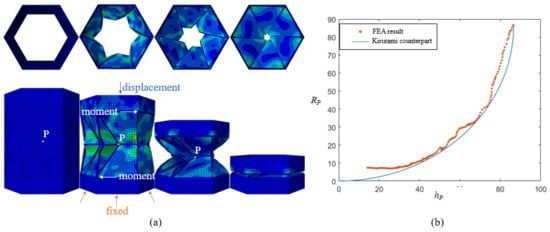 (a) FEA simulation folding process. (b) The trajectories of point under the FEA results and the rigidly foldable kirigami counterpart result. (n = 6).