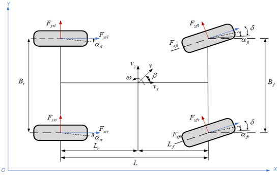 In Figure 1, is the yaw rate; is the sideslip angle; and are the distances from the front axle and rear axle to the center of centroid, respectively; is the total distance between the front axle and rear axle of the vehicle, and are the front track width and rear track width, respectively; is the front steering angle; and are the longitudinal velocity and lateral velocity at the center of centroid of vehicle, respectively; is the slip angle; and and denote the longitudinal tire force and the lateral tire force, respectively (the first subscript of denotes front wheel and rear wheel, and the second subscript denotes left wheel and right wheel).