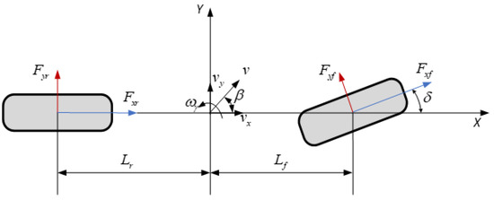 The 2DOF vehicle model does not consider the effects of tire nonlinearity, steering, or suspension. The car is driving in the linear region, which can better describe the stable state of the vehicle and the driver’s driving intention. The linear 2DOF vehicle model is always regarded as the reference model, and the ideal values of parameters such as the yaw rate and sideslip angle can be obtained. Therefore, the 2DOF vehicle model needs to be analyzed.