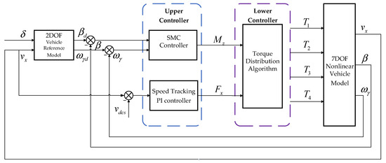 Many studies show that direct yaw moment control (DYC) is one of the most effective control strategies to improve handling stability [5,6,7,8,9]. According to the existing literature, lateral stability control generally adopts a hierarchical structure to keep the control variables following the ideal value [10,11]. The DYC method includes two levels of control, where the upper controller provides the desired yaw moment, and the lower controller reasonably distributes the yaw moment to the four wheels.