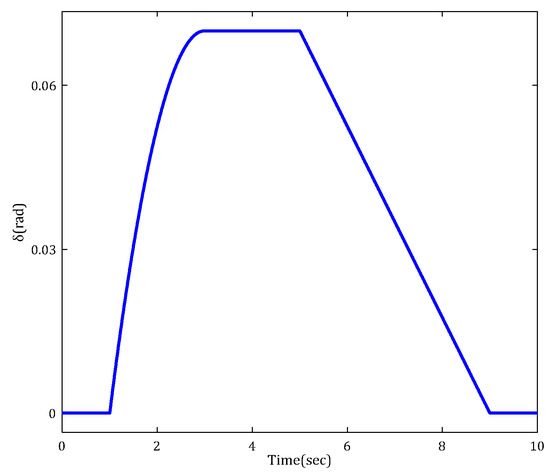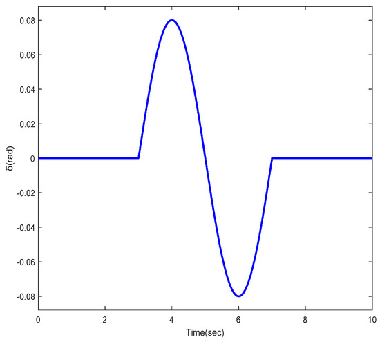 The front wheel corner input is given a sine-wave input (3–7 s) with an amplitude of 0.08 rad, as shown in Figure 5. Road friction coefficients are set as 0.5 to simulate wet roads. The starting speed is set to 108 km/h.