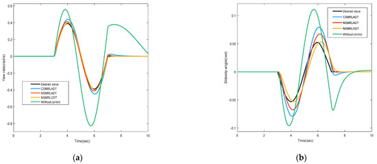 The two stability index curves under the condition of SLC are shown in Figure 6. The peak value under control is lower than without control, the changes in the curve are relatively gentle, and the changing trend is more suitable for the SLC maneuver. It shows that the proposed control strategy can improve the vehicle’s stable driving and trajectory-keeping ability. In contrast, NSMRLODT has relatively lower peak values and smaller fluctuations, showing a suitable performance, which indicates that the NSMRLODT method has an adequate control effect.