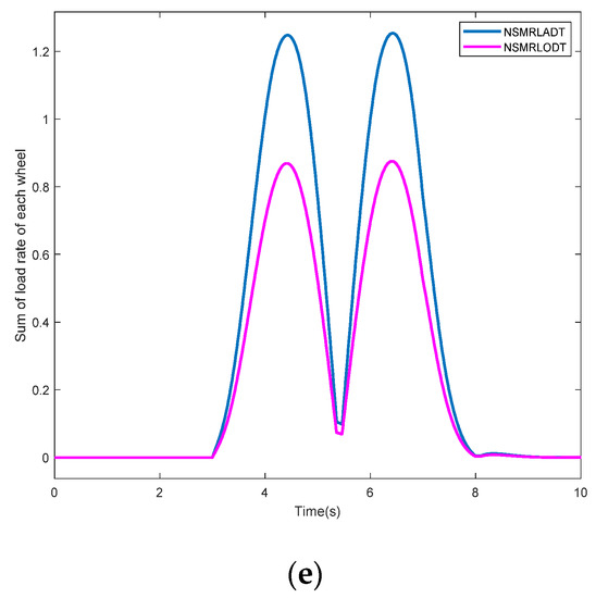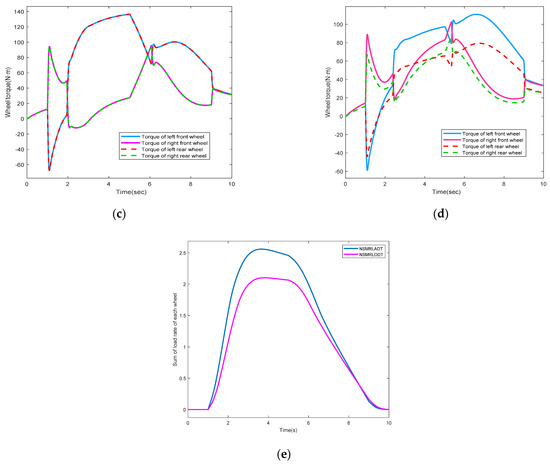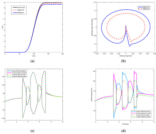 The simulation comparison results between NSMRLADT and NSMRLODT are shown in Figure 7. The vehicle track is given in Figure 7a. NSMRLADT and NSMRLODT can better track the desired trajectory path. Vehicles with ODT control have better lateral stability compared to ADT control. The phase diagram is shown in Figure 7b. The sideslip angle of the two methods is in the controllable range and presents a closed-loop convergence structure. Still, the overall control effect of NSMRLODT is superior to NSMRLADT. The ADT and ODT are shown in Figure 7c,d, respectively. The torque of the same side wheel under NSMRLADT control is the same, while the NSMRLODT control method can distribute the torque required to change among four respective in-wheel motors. It is possible to prevent the wheel with a small vertical load from quickly reaching the longitudinal force saturation. Although the torque distribution trend of the wheel on the same side under the NSMRLODT control method is the same, the amplitude is different. The front wheel torque is greater than the rear wheel torque, and this is because the front wheel is a steering wheel. As shown in Figure 7e, the sum of the load ratios of each wheel of NSMRLODT is smaller than that of NSMRLADT, indicating that the torque of each wheel is reasonably distributed under NSMRLODT. The maximum stability margin is kept as much as possible under the precondition of meeting the current yaw moment control. Leaving sufficient longitudinal force at the disposal of the car can make the vehicle more secure and reliable.