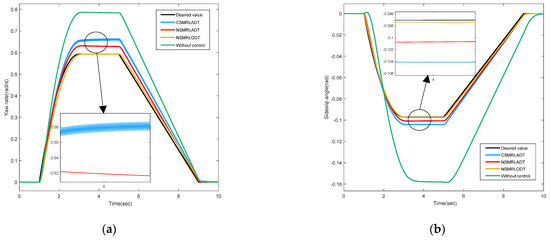 The curves of yaw rate and sideslip angle under SLC maneuver. (a) Yaw rate; (b) sideslip angle.