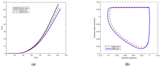 The simulation comparison results between NSMRLADT and NSMRLODT are shown in Figure 10. Note that the NSMRLODT introduced here is still effective in improving stability in extreme J-turn maneuvers. Based on the analysis of the above results, NSMRLODT is more suitable for the ideal state than NSMLRLADT.
