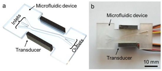 - Destgeer, G.; Lee, K.H.; Jung, J.H.; Alazzam, A.; Sung, H.J. Continuous Separation of Particles in a PDMS Microfluidic Channel via Travelling Surface Acoustic Waves (TSAW). Lab A Chip 2013, 13, 4210–4216. [Google Scholar] [CrossRef]
