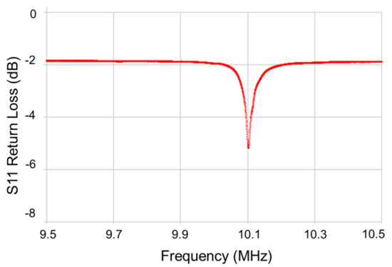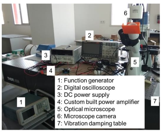 The experiments were conducted on the sample stage of an inverted optical microscope (OX.2053-PLPH, Euromex, Arnhem, The Netherlands) equipped with 10× and 20× objective lends and a CMOS camera (HD, Euromex, Arnhem, Netherlands). The piezo ceramic transducers were driven at higher harmonics and their working frequency was determined using a vector network analyzer (NanoVNA, Huayang, Guangdong, China). A resonance mode of the transducers that was observed at 10.11 MHz (Figure 2) was implemented in the experiments. A function generator (TBS2104, Tektronix, OR, USA) was used to drive the transducers. A custom-built RF amplifier was used to amplify the driving frequency. Two transducers were driven at the same driving frequency. A programmable syringe pump was employed to infuse the solutions into the device [42]. The experimental setup is shown in Figure 3.