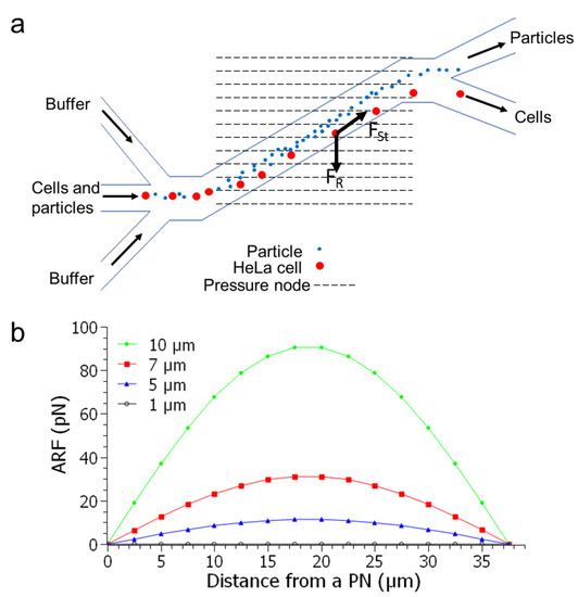 In Figure 4a, cell and particle separation is schematically illustrated. In this device, cell and particle suspension in infused from the center inlet and hydrodynamically focused before entering the acoustic field. In the laminar flow, cells and particles preserve their relative position inside the channel. In the standing acoustic field, the periodic linear pressure field that are aligned with a tilt angle to the flow direction forces suspended inclusions to move along the minimum pressure lines. In this process, the acoustic radiation force pushes cells and particles to the pressure nodes, but larger cells experience a bigger force compared to the particles. Therefore, cells tend to follow the pressure node lines rather than the flow streamline and become separated from the smaller particles. The scaling of the acoustic radiation force for 10 µm, 7 µm, 5 µm, and 1 µm polystyrene particles is given in Figure 4b. In this calculation, the fluid medium is considered as water, acoustic pressure is assumed to be 0.2 MPa, the acoustic wavelength is set to be 150 µm, compressibility of the particles and the fluid are 4.58 × 10−10 Pa−1 and 2.46 × 10−10 Pa−1, and density of the particles and the fluid are 1050 kg m−3 and 1000 kg m−3, respectively [17,45,46]. From Equations (1) and (2), it is evident that 10 µm diameter particle will experience a much larger acoustic radiation force compared to smaller particles. It is also evident that particles with higher densities will result in a larger force. Because HeLa cells (1040 kg m−3) and polystyrene particles (1050 kg m−3) have very similar densities, their volume differences will have a rather significant effect on the scale of the acoustic radiation forces.
