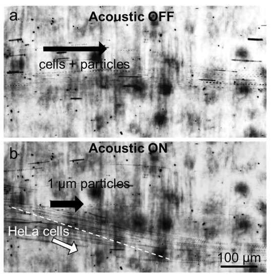 Separation of HeLa cells and polystyrene particles is shown by stacked images. (a) When the acoustic field is turned off, the mixture of the particles and cells flow together. (b) In the standing acoustic wave field, HeLa cells mostly follow the pressure nodes and separated from the smaller polystyrene particles.