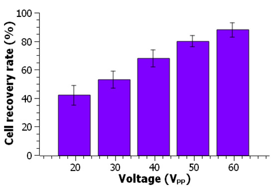 Characterization of HeLa cell recovery efficiency as a function of the applied voltage. Error bars are standard deviation of 5 measurements.