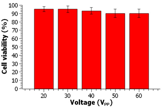 The deflection of the HeLa cells needs to be high enough to separate them from the particles and cell debris and push them to the lower outlet. For this, increasing power amplitudes were applied and for each case number of HeLa cells recovered from the original solution was characterized as shown in Figure 6. Starting from 20 VPP, the applied voltage was increased up to 60 VPP which was the highest voltage provided by the amplifier circuit. At the highest voltage, over 88% HeLa cell recovery was obtained at around 92% cell purity. Cell recovery rate is calculated by the ratio of the number of the sorted target cells and the number of the target cells available for separation. Cell purity is defined as the ratio of the number of the target cells isolated and the total number of the cells and particles isolated. Cell viability is defined as the ratio between the difference of total number of cells–stained cells and the total number of cells. Here, the stained cells are the dead ones that intake the staining dye. The viability of the HeLa cells was also characterized after they are acoustically being separated from the particles. HeLa cell viability values for increasingly higher applied voltages are shown in Figure 7. At lower voltage amplitudes, the viability of the HeLa cells was found to be over 95%. As the voltage was increased, the viability was dropped to about 90% at 60 VPP.