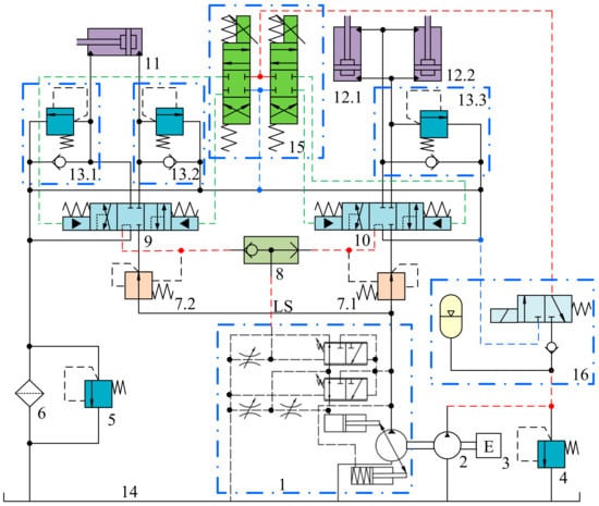 Figure 1 shows the hydraulic system schematic diagram of the loader actuator. The system consists of a boom subcircuit and a bucket subcircuit. Shuttle valve 7 feeds back the maximum pressure of each subcircuit to load-sensing pump 1. Load-sensing pump 1 supplies boom cylinders 12.1 and 12.2, and bucket cylinder 11. Due to the use of pre-valve pressure compensation technology in both branches, i.e., pressure compensation, valves 7.1 and 7.2 are respectively in a series in front of the main valves 10 and 9, cylinders 12.1 and 12.2, and cylinder 11 can perform combined actions. Safety valve 4 has overload protection. One-way relief valves 13.1, 13.2, and 13.3 have overload protection and oil-filling functions. The pilot pressure controller 16 guarantees a stable pilot pressure in the pilot circuit.