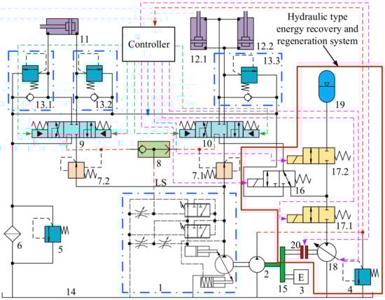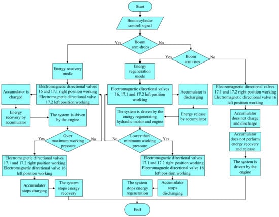 Figure 2 shows the schematic diagram of hybrid loader actuators’ energy recovery and regenerative hydraulic system. The system consists of the loader actuator hydraulic and the hydraulic energy recovery and regeneration system. Figure 3 shows the system energy recovery and regeneration control strategy diagram. The control strategy is based on the boom cylinder control signal. When the boom arm drops, the system enters energy recovery mode. Valves 16 and 17.1 work in the right position, and valve 17.2 works in the left position. Accumulator 19 is charged. Accumulator 19 recovers energy, and the system is driven by engine 3. When the working pressure of accumulator 19 is over the set maximum working pressure, valve 16 works in the left position, and valves 17.1 and 17.2 work in the right position. Accumulator 19 stops charging, and the system stops energy recovery. Otherwise, energy recovery continues. When the boom arm rises, the system enters the energy regeneration mode. Valves 16, 17.1, and 17.2 work in the left position. Accumulator 19 releases energy, and the system is driven by engine 3 and energy regeneration hydraulic motor 18. When the working pressure of accumulator 19 is lower than the set minimum pressure, valve 16 works in the left position and valves 17.1 and 17.2 work in the right position. Accumulator 19 stops discharging, i.e., the system stops energy regeneration. Otherwise, continue to regenerate energy. When the boom cylinder is stationary, valve 16 works in the left position and valves 17.1 and 17.2 work in the right position. Accumulator 19 is not charged and discharged. Accumulator 19 does not perform the recovery and release of energy, and the system is driven by engine 3.