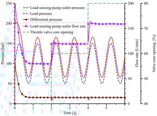 As mentioned above, the flow rate required by the system’s load is independent of the load pressure and proportional to the opening area of the proportional throttle valve. It implements the primary function of the load-sensing pump in preparation for subsequent research.